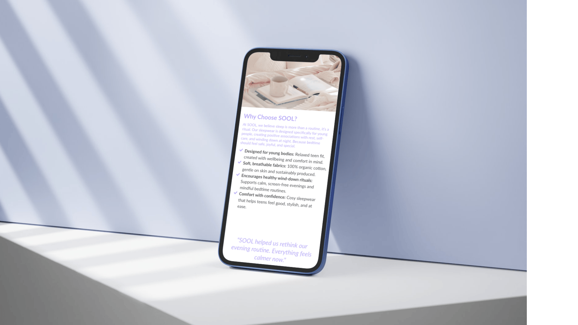 A minimal, mobile-first layout was designed to align with SOOL’s visual identity and existing social content. Video was incorporated to reflect the brand’s calm, slow-paced tone and reinforce positive associations with rest and sleep.